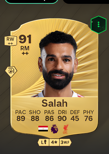 Mohamed Salah's Gold Rare card stands out as a premier Right Midfielder, boasting an impressive overall rating of 91. With remarkable attributes such as 89 pace, 88 shooting, 86 passing, and an exceptional 90 dribbling, Salah is perfectly equipped to dominate the flanks. His combination of speed and technical skill makes him a constant threat, allowing players to swiftly break through opposing defenses and create decisive scoring opportunities. As a winger, Salah’s sharp attacking prowess can be the key to unlocking tight matches and securing vital goals when it matters most.