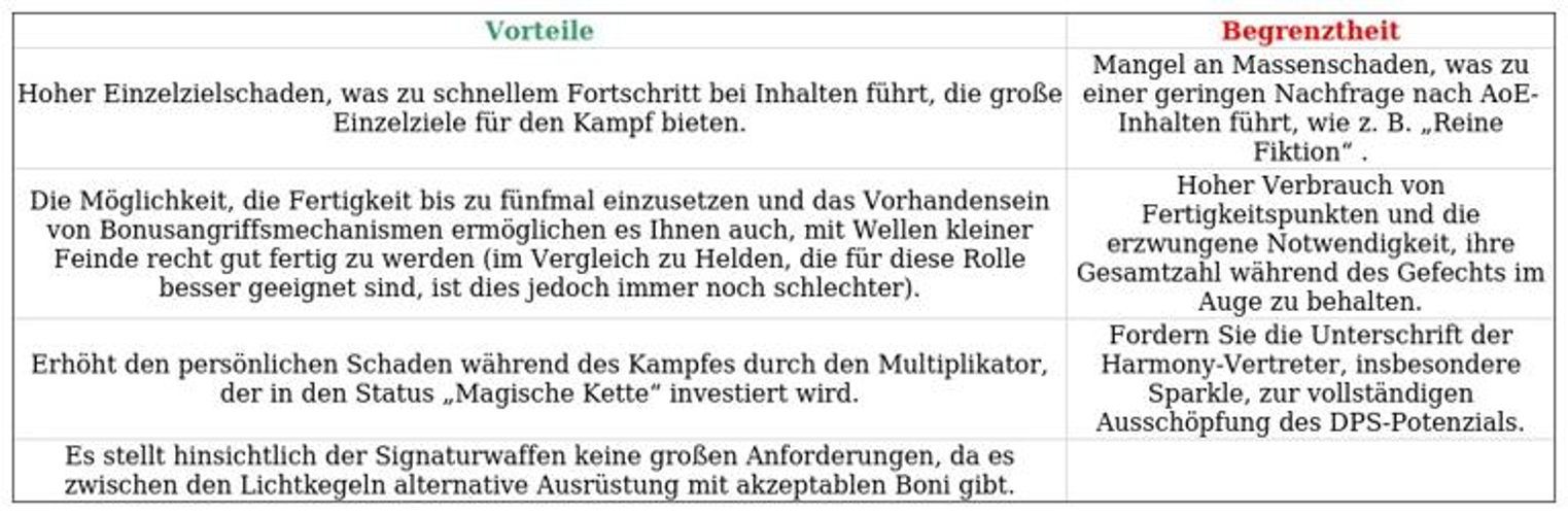 Im Folgenden werden die bedeutendsten Vor- und Nachteile des Charakters analysiert.