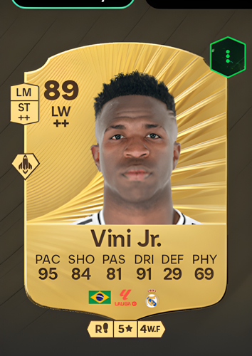 Vinícius José de Oliveira Júnior’s Gold Rare card stands out as a dynamic Left Wing option with an impressive overall rating of 89, highlighted by exceptional pace (95), dribbling (91), and solid shooting (84). These attributes make him a formidable presence on the flank, capable of slicing through defenses with blistering speed and close ball control. As a winger, Vinícius excels at creating scoring opportunities, exploiting gaps in the opposition, and delivering decisive moments that can secure victory for your team. His combination of agility and attacking prowess ensures he remains a constant threat, perfect for players seeking to dominate matches from the wing.