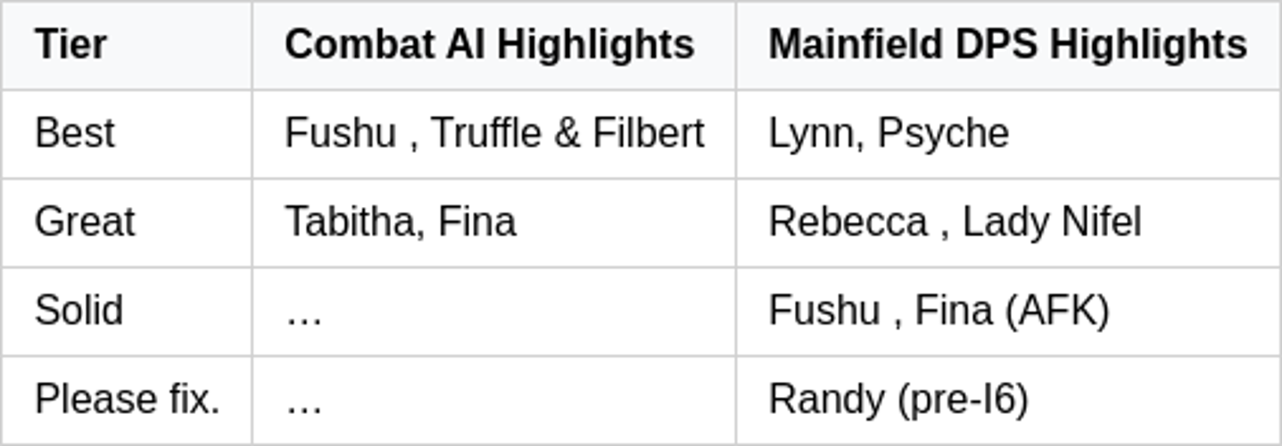 - Rankings generally exclude I6 unless specifically mentioned, such as for Inifel or Rhythm Shine dupe strategies.