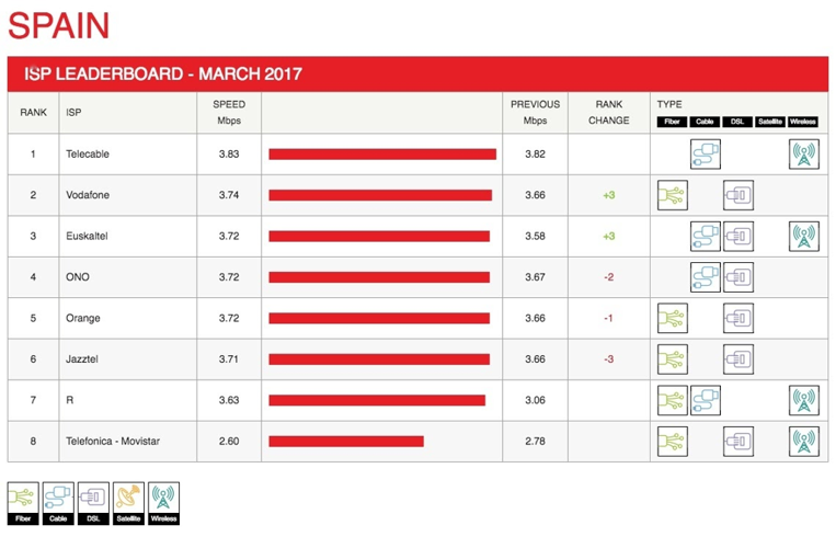 Spain's telecom sector saw a significant boost, with R achieving the highest monthly increase of 0.57 Mbps, elevating its average to 3.63 Mbps from February’s 3.06 Mbps. This improvement allowed Vodafone to climb three spots to second place, while Euskaltel also advanced three positions to third.
