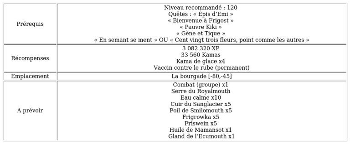 Pour la prochaine étape, rassemblez 5 poils de Smilomouth et 5 cuirs du Sanglacier en vous rendant en [-65,-50]. Gormor l’Équarisseur vous donnera alors un écumouth vivant, que vous devrez mettre dans votre inventaire. Munissez-vous ensuite de 5 friswein en [-77,-44] et de 5 frigrowka en [-81,-41], que vous achèterez à la taverne.