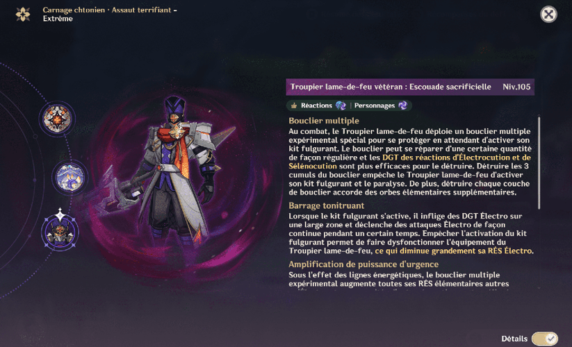 En outre, tant qu’un bouclier est actif, toutes les résistances du troupier augmentent de 60 %, sauf celle liée à l’électro.
